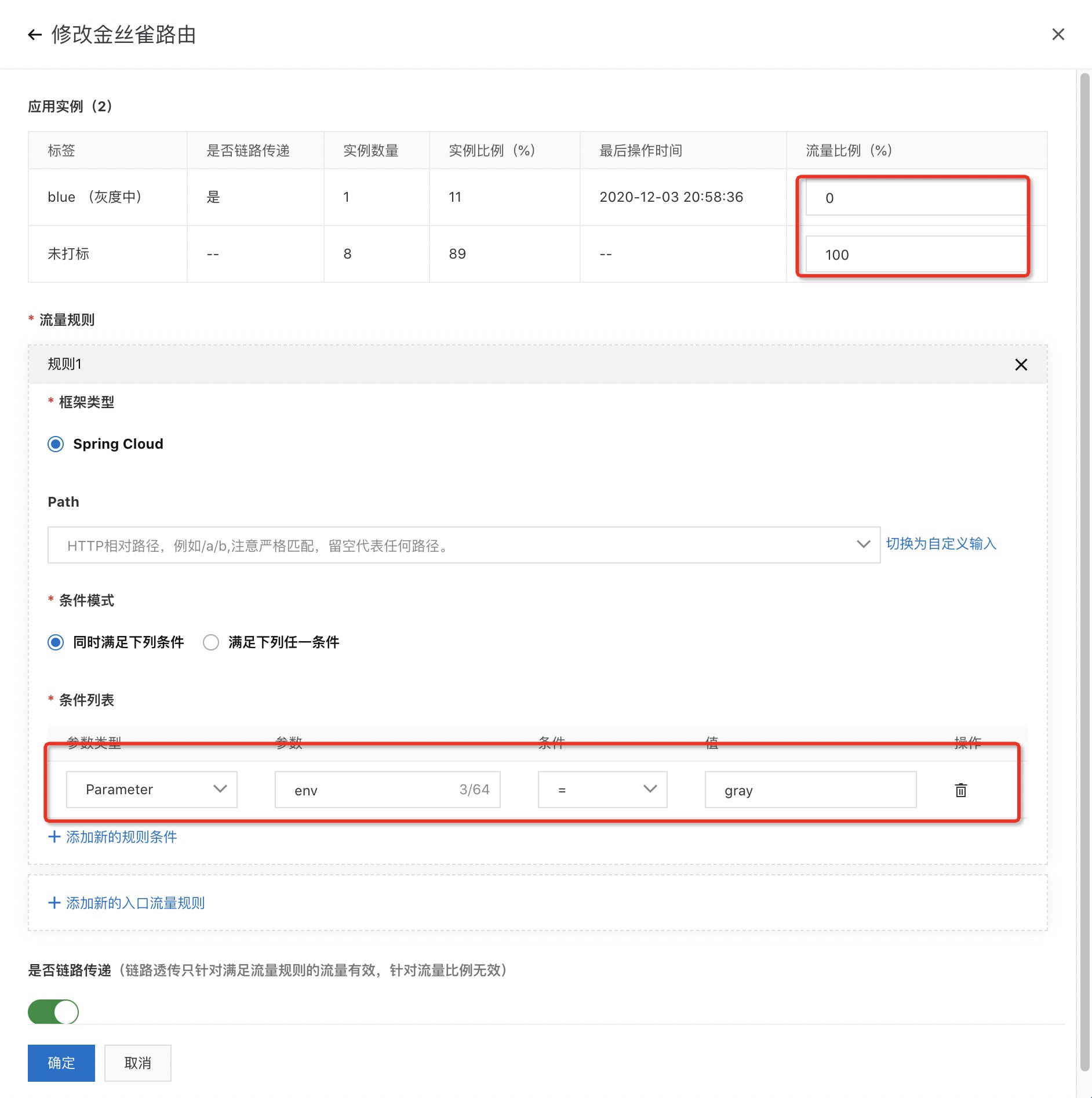 是否链路传递 | 是否把当前应用里识别出的灰度流量的标签传递下去,本例中选择继续传递下去完成全链路的金丝雀能力的验证 |