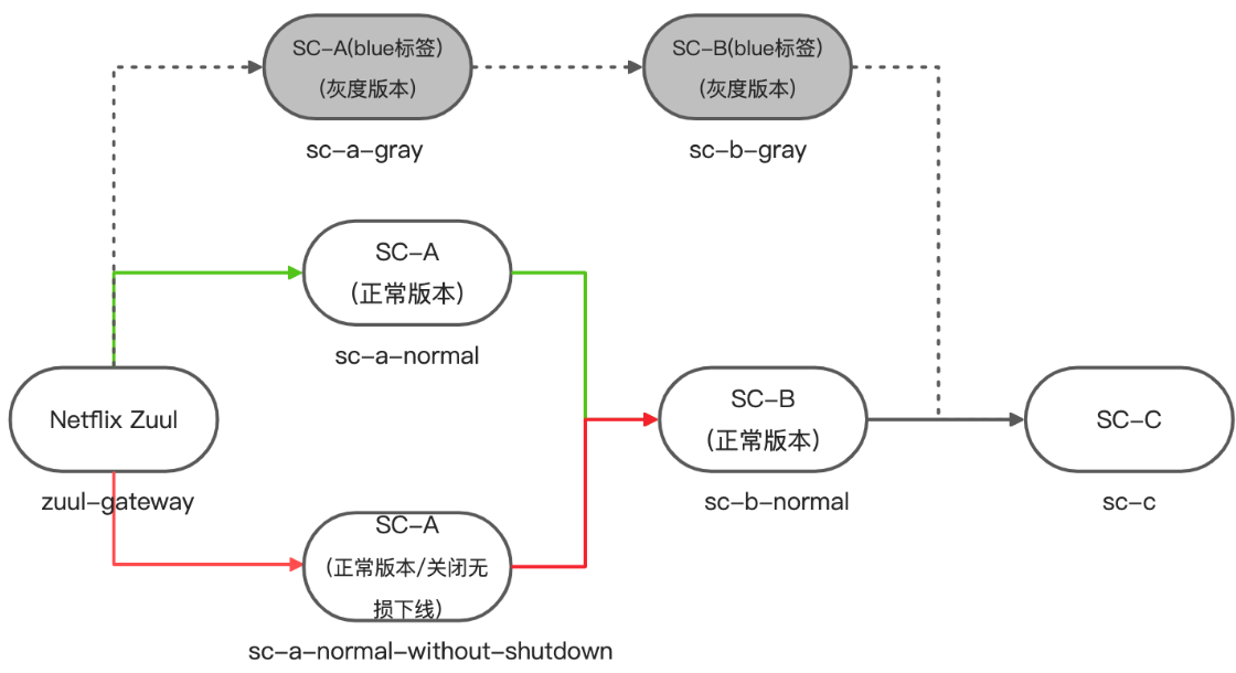 Demo应用的架构如下图所示。流量从 Netflix Zuul 对应的 Ingress 进来,会调用 SC-A 应用对应的服务,SC-A 应用内部调用 SC-B 应用的服务,SC-B 应用内部调用 SC-C 应用的服务。其中sc-a-gray、sc-b-gray用于金丝雀发布演示,SC-A 的正常版本通过两个 Deployment 部署,其中带 -without-shutdown 的 Deployment 关闭无损下线功能,不带 -without-shutdown 的 Deployment 会被 MSE 默认开启无损下线功能。关闭无损下线的 Deployment 在下线/缩容等场景下会出现流量损失、业务报错的问题。