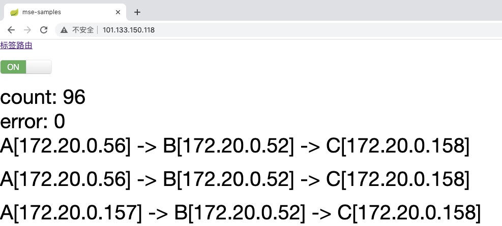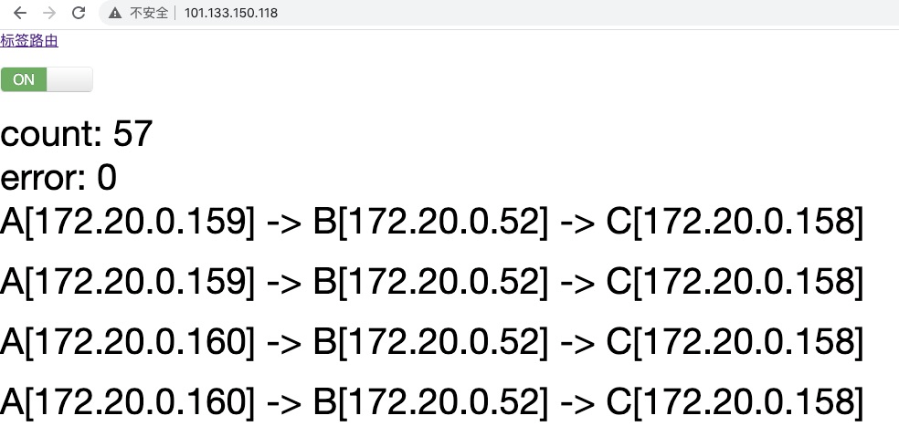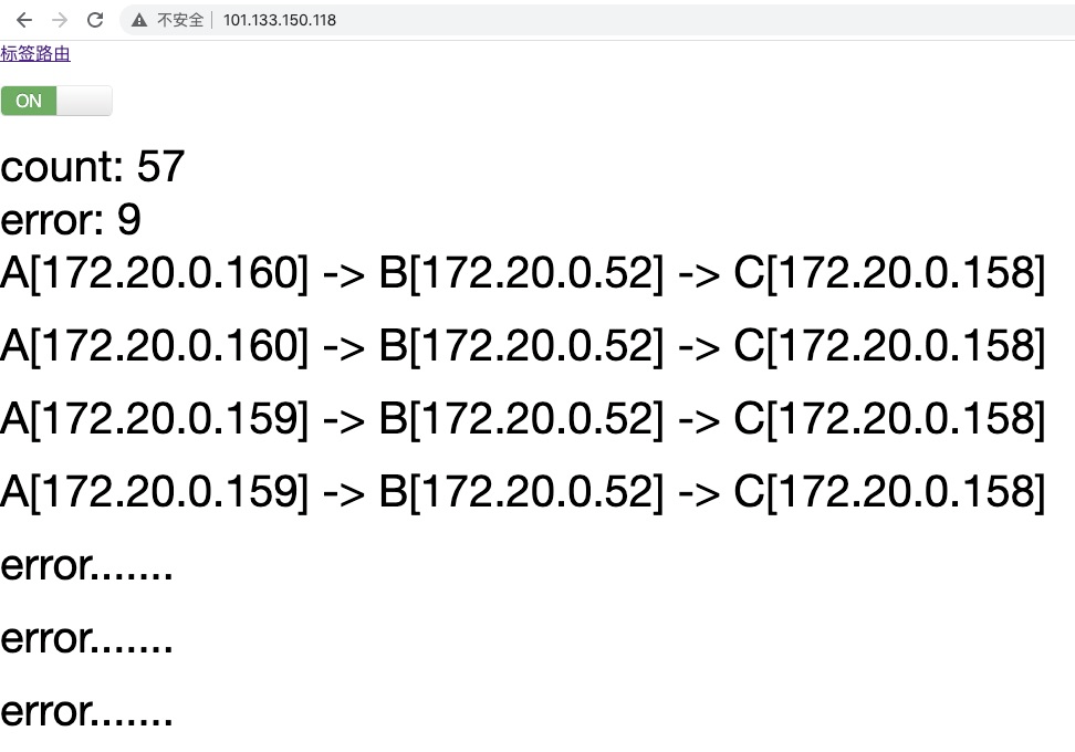 当我们打开开关页面就会不断去访问后端服务,并且将结果打印至页面,对应的字符串是 A[] ->B[] ->C[] ,其中[]中的内容是对应服务提供者的ip,我们可以看到A[]中的ip在不断变化,其中会记录调用的总数与调用失败的次数