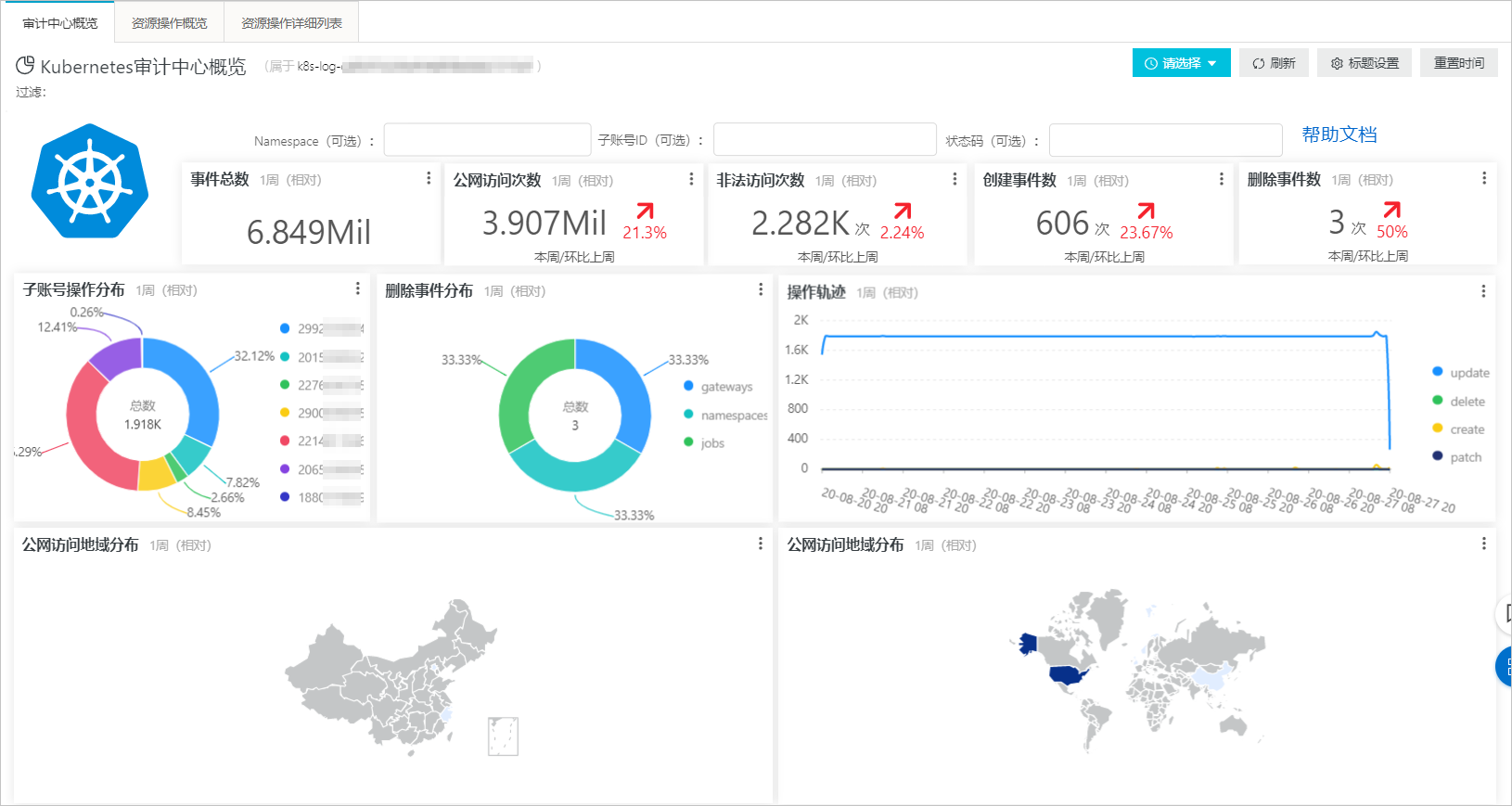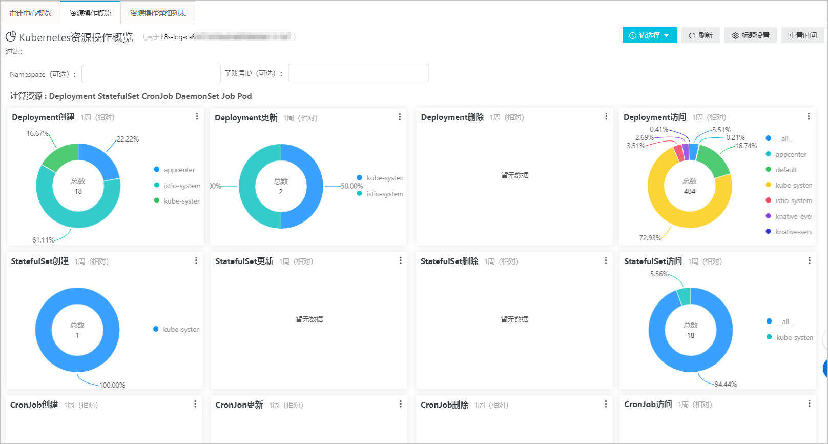 资源操作概览展示Kubernetes集群中常见的计算资源、网络资源以及存储资源的操作统计信息。操作包括创建、更新、删除、访问。