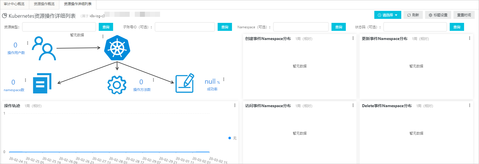该报表用于展示Kubernetes集群中某类资源的详细操作列表。您需要选择或输入指定的资源类型进行实时查询。该报表会显示资源操作各类事件的总数、Namespace分布、成功率、时序趋势以及详细操作列表等。