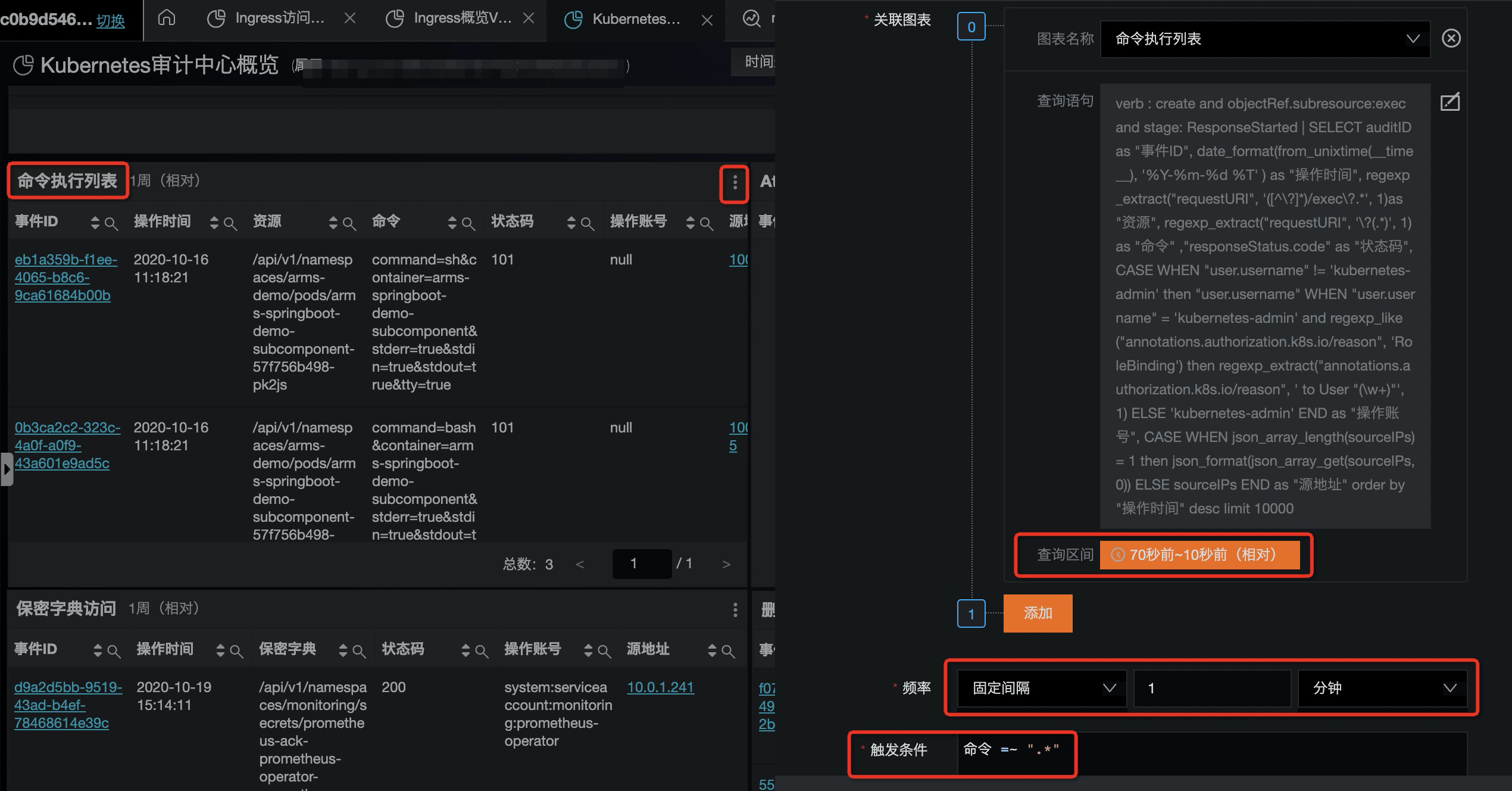 某公司对于Kubernetes集群使用有严格限制,不允许用户登录容器或对容器执行命令,如果有用户执行命令时需要立即给出告警,并希望告警时能够显示用户登录的具体容器、执行的命令、操作人、事件ID、时间、操作源IP等信息。